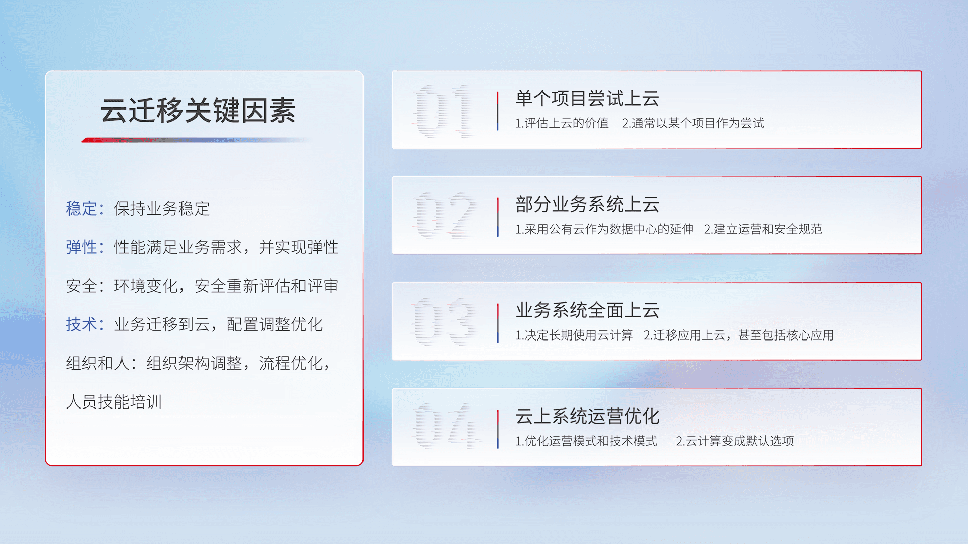 结合实际业务,,,,从规划设计、、、云平台选型、、、云原生改造、、、数据迁移、、集成交付,,,迁移全过程为客户识别最佳上云路径,,做好风险识别管理,,设计网络架构、、、、身份权限、、、、安全审计合规、、、操作审计、、、、日志审计、、、监控告警策略、、、、多站点容灾设计等,,,,对云上基础设施进行整体规划,,,,提升IT治理水平,,以满足弹性、、高可用、、高性能的需求。。
