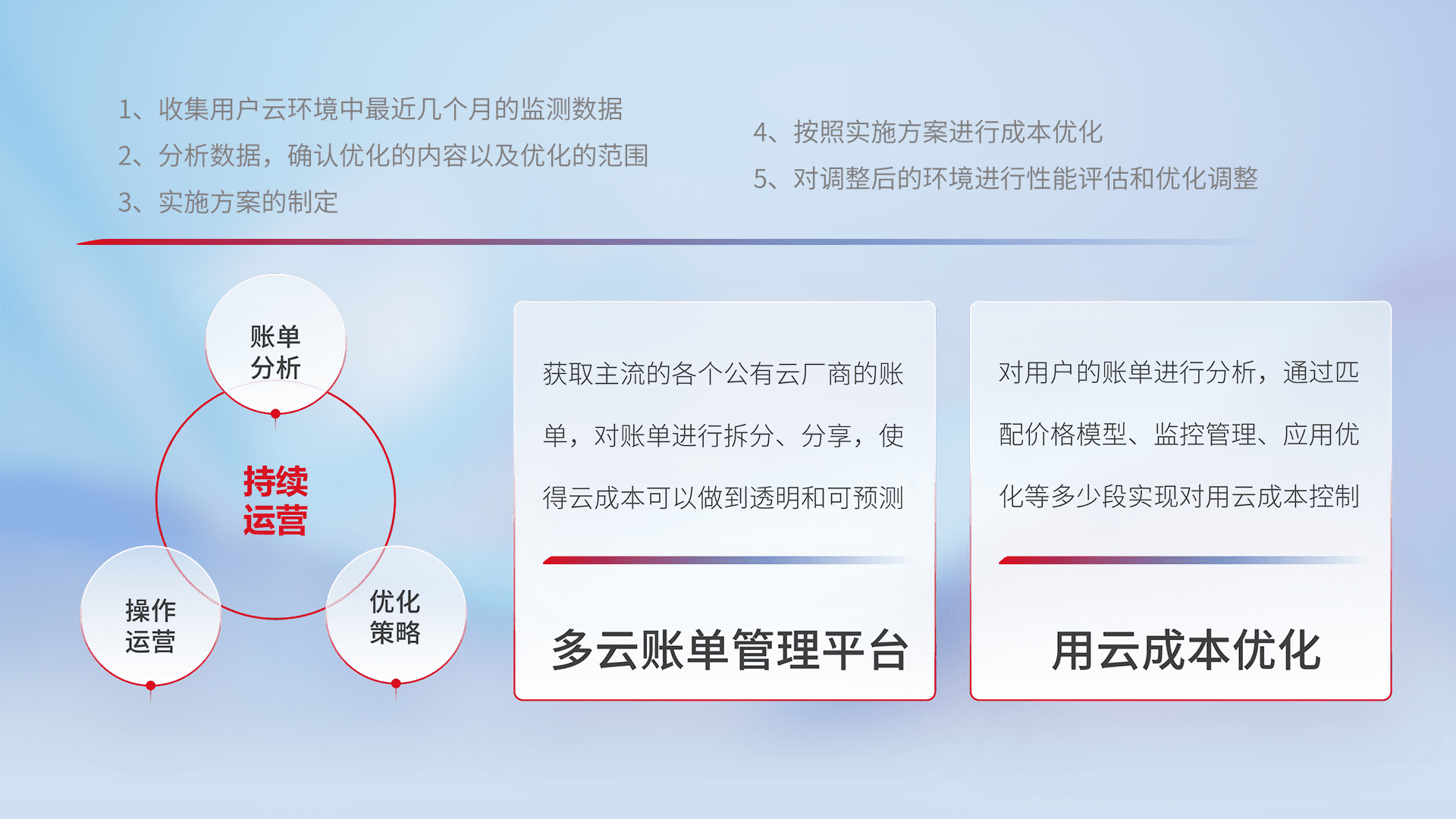 通过多云纳管,,,,以统一的资源数据模型把客户的云资源进行抽象和封装,,,进而实现对多云资源的统一操作,,保障云资源管理的可靠性、、、、稳定性与可用性。。量身定制化运维内容,,,配置、、、开发运维、、、补丁管理、、、、备份、、监控、、认证和访问管理、、审计和日常巡检等,,,,保障在用云过程中的可靠度,,,稳定度以及高可用率。。。。